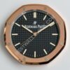 Valmistettu rose gold -viimeistelyllä, jossa on näkyvät ruuvit, jotka ovat Royal Oakin tunnusmerkki.Mustan Tapisserie-tyylinen kellotaulu